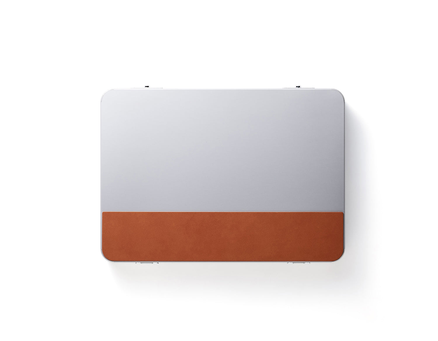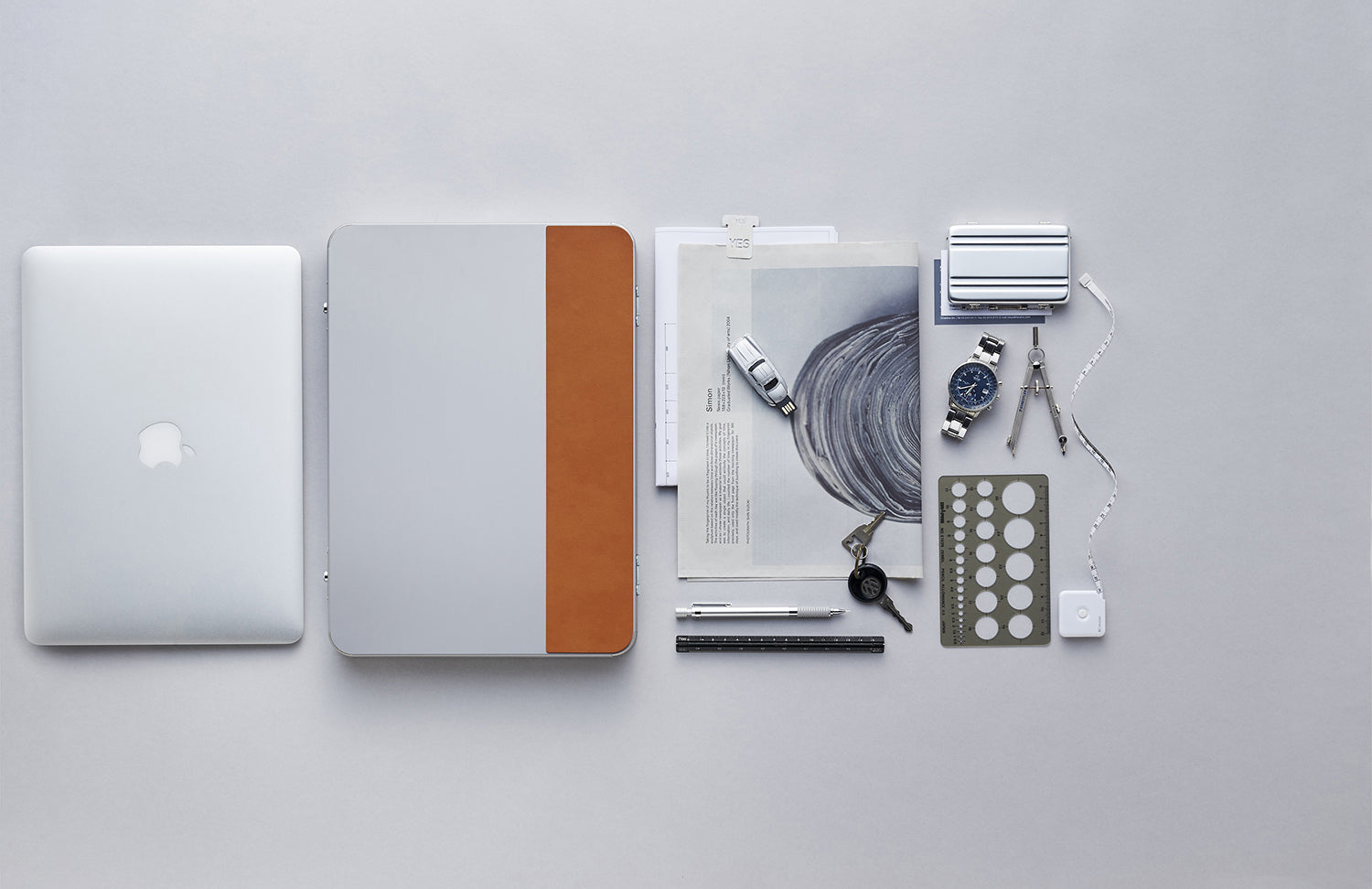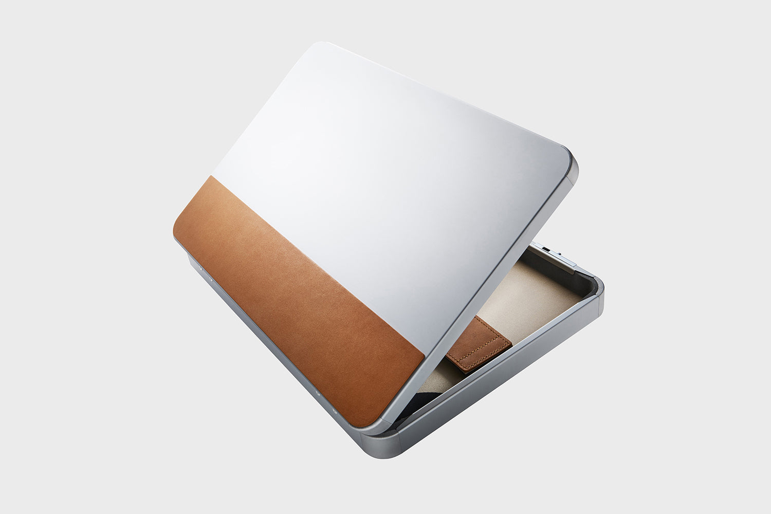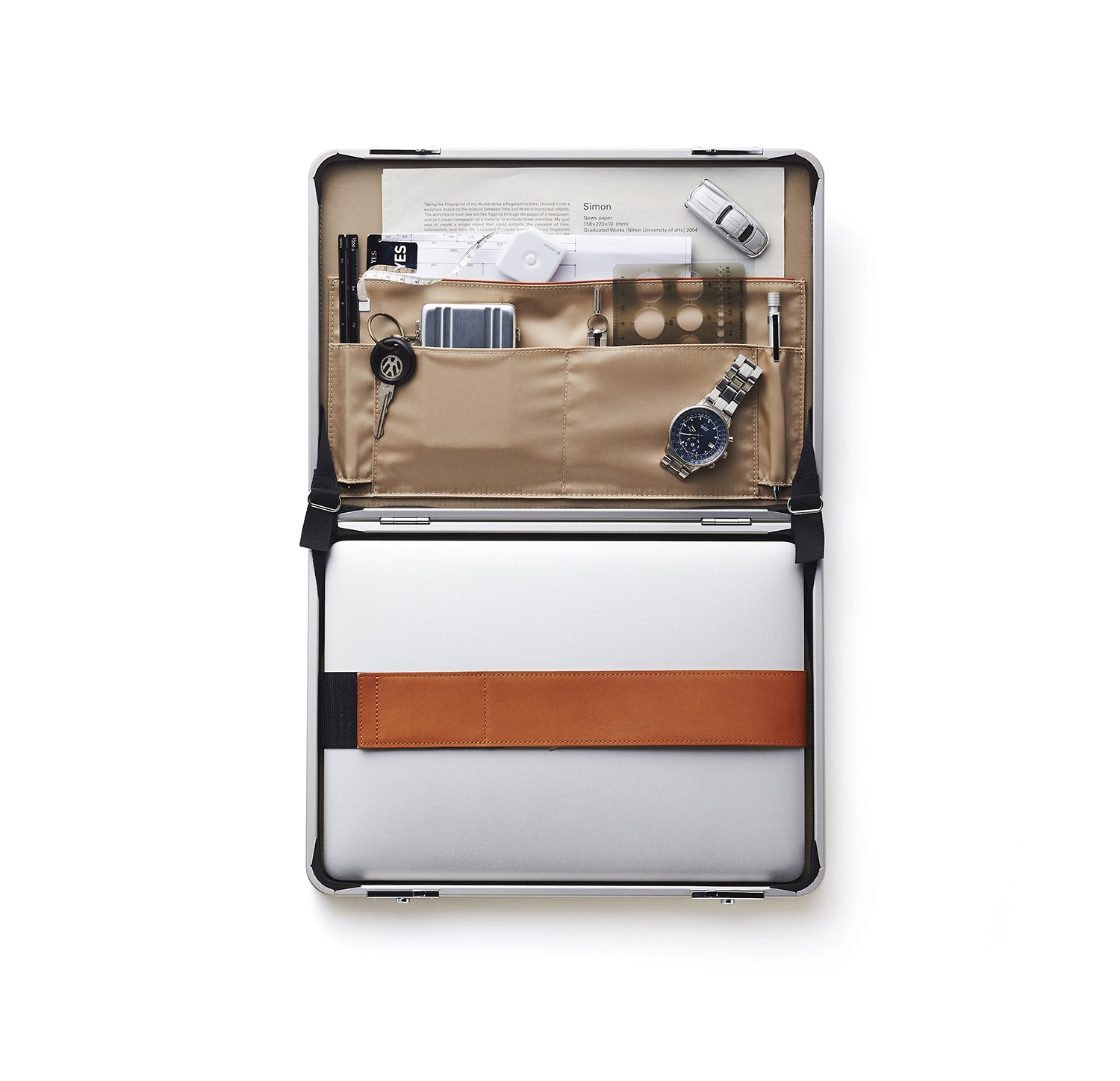 インナーパッドと本革バンドがノートパソコンを守り、機能的にレイアウトされたポケットがA4ドキュ メントや文房具をすっきり整理。バッグインバッグとしても、あるいはそのままでも持ち出せて、座ったその場をデスクに変えてしまう機動力が魅力。